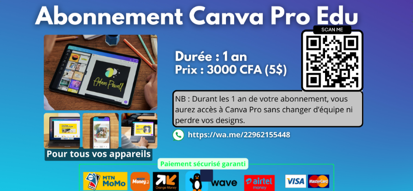Après le paiement, vous aller nous envoyer une capture montrant que vous avez éffectué le paiement avec succès. Et aussi votre adresse mail Canva. C'est dedant que vous aller recevoir votre invitation à rejoindre notre équipe.