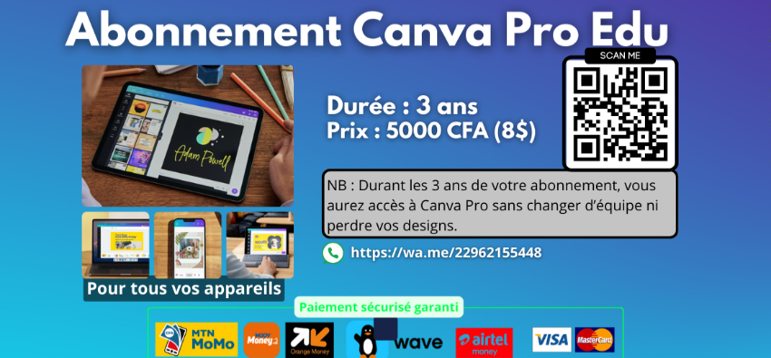 Après le paiement, vous aller nous envoyer une capture montrant que vous avez éffectué le paiement avec succès. Et aussi votre adresse mail Canva. C'est dedant que vous aller recevoir votre invitation à rejoindre notre équipe.