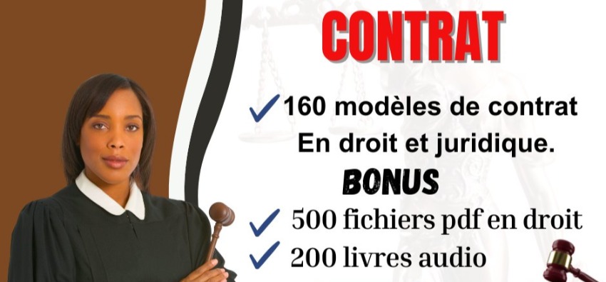 Plus de 160 mod?les de contrats au format Word, facilement modifiables, accompagn?s d'une biblioth?que num?rique de plus de 500 livres en format PDF sur le droit, ainsi que des livres audio. Ces ressources vous seront envoy?es par e-mail et via WhatsApp.