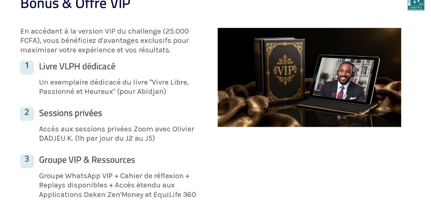 En choisissant l'option VIP (25.000 FCFA), vous bénéficiez d'un accès privilégié pour approfondir votre transformation dès les premiers jours du Challenge :