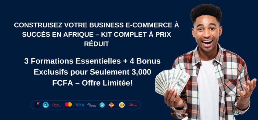 Remplissez le formulaire et validez votre commande pour obtenir l'int?gralit? du Kit Ecommerce Rentable en Afrique ? 3,000 FCFA. Transformez vos ambitions en r?alit? et d?marrez votre business en ligne avec succ?s.